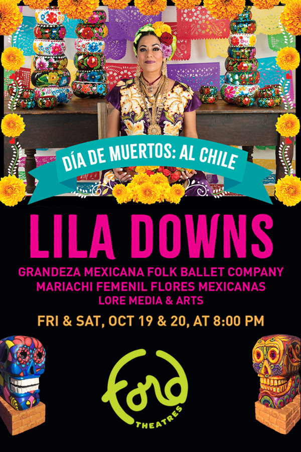 Septiembre, 2019, Los Ángeles, CA – Ford Theatres presenta Lila Downs Día de Muertos: Al Chile, un espectáculo incomparable con la participación de una de las compañías líderes del baile folclórico Grandeza Mexicana Folk Ballet Company; también el Mariachi Femenil Flores Mexicanas, establecido como uno de los grupos líderes de mariachi femenino del suroeste. Instalaciones artísticas LORE Media & Arts, el sábado 19 y domingo 20 de octubre, 2019 a las 8:00pm en el Ford Theatres de Hollywood. Uniéndose a la estrella de la música, seis veces ganadora al GRAMMY®, Lila Downs, en un programa que incluye canciones de su nuevo álbum Al Chile. Su herencia Mixteca India fusionada con sonidos internacionales y géneros musicales, Lila cantará en español, inglés y en los dialectos de las culturas Mixteca, Zapoteca, Maya, y Náhuatl – mostrando su habilidad de mezclar interpretaciones de blues, jazz y soul, cumbia, rock, además de rap, y klezmer, como también su rendición personal de rancheras clásicas.
