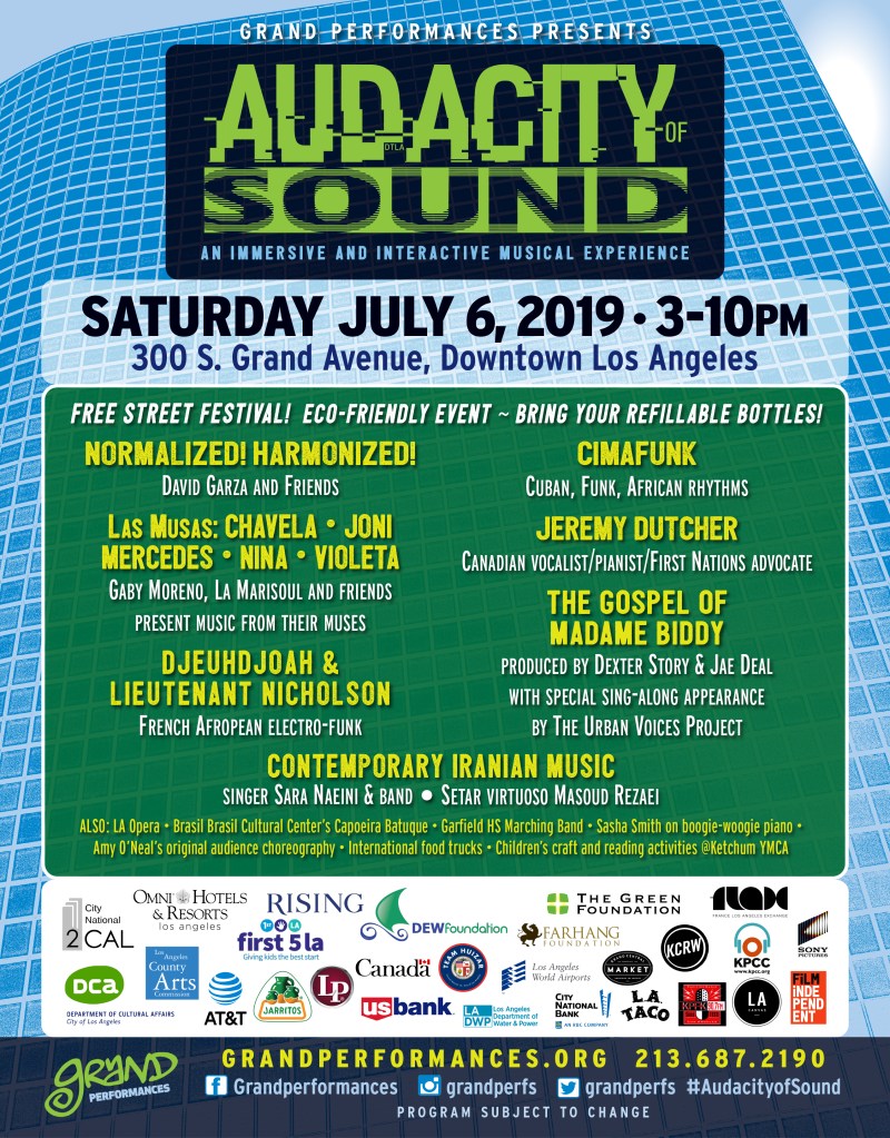 Vesper Public Relations. Los Ángeles, CA. Julio, 2019. Grand Performances presenta Audacity of Sound, un evento que tendrá lugar el próximo 6 de julio, 2019 de 3:00 pm-10:00 pm. El festival musical familiar gratuito a cargo de Grand Performances continúa con la misión de presentar el trabajo de artistas locales e internacionales que rebasa los límites de la creatividad, abre las mentes y reta al pensamiento convencional en un ambiente inclusivo y amistoso.